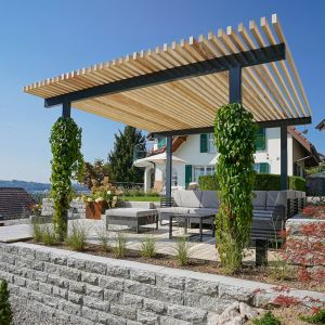 … Schraubfundamente für eine einfache und schnelle Montage, Geländer für Treppen, Balkone und Terrassen, Sonnensegel und Sonnenschirme in verschiedenen Grössen und Farben sowie Pergolen zum Schaffen eines schattigen Plätzchens im Garten.
